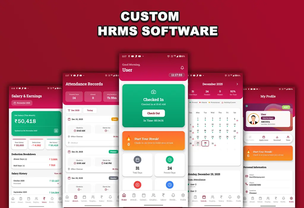 Custom HRMS software simplifies your HR role with elements. To handle employee information, attendance, payroll, leave management, and employee performance. It is globally accessible and secure.